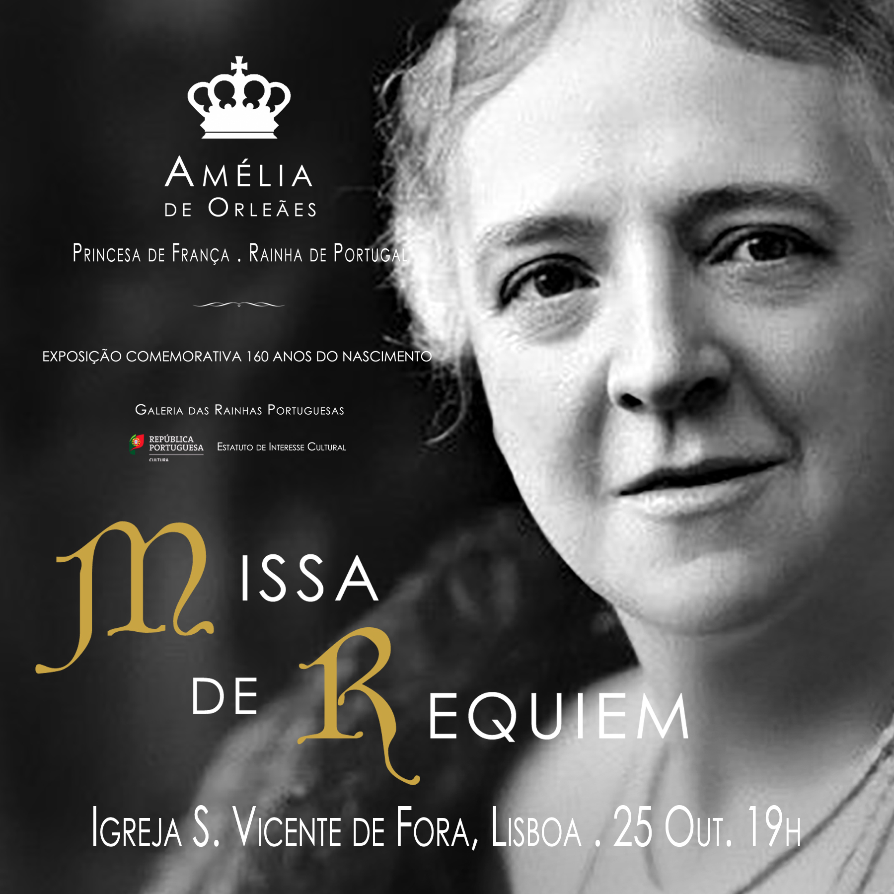 A Missa de Requiem, com o serviço musical da Capella de S. Vicente, realiza-se no âmbito do 160.º Aniversário do nascimento da última rainha de Portugal, D. Amélia de Orleães, com a exposição Galeria das Rainhas Portuguesas – Amélia de Orleães, Princesa de França . Rainha de Portugal, criada pela Matriz Portuguesa – Associação para o Desenvolvimento da Cultura e do Conhecimento.
